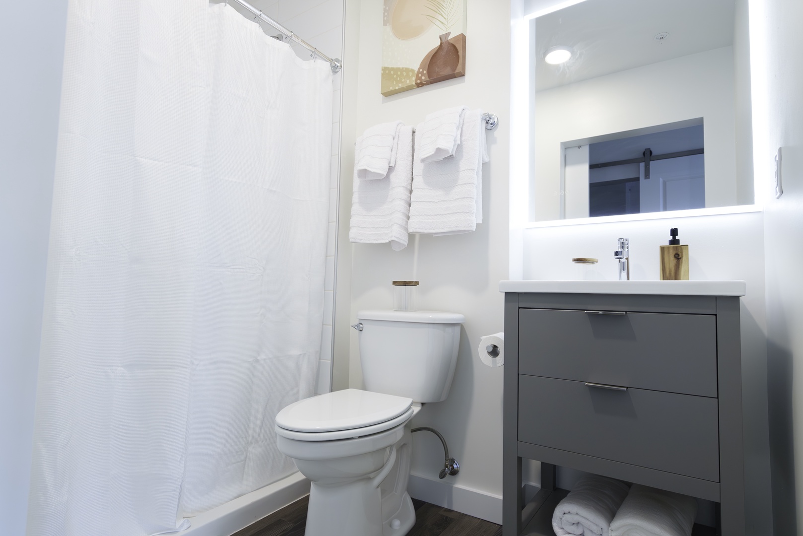 The bedroom is a sanctuary of comfort, furnished with a plush queen-sized bed and tasteful decor. After a day of adventures, sink into the soft linens and enjoy a peaceful night's sleep. The apartment also includes a clean and modern bathroom with a walk-in shower, providing a refreshing start to your day.